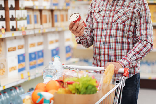 Interested Latin American man reading product label on jar while choosing groceries in supermarket