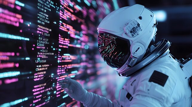 A futuristic spaceman reading programming code with it being reflected over his space helmet. Future concept. 3D illustration.