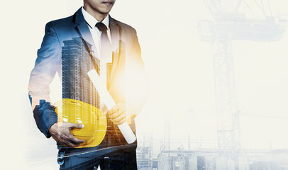 Double exposure image of engineer holding safety helmet with city view and construction site.The boss have vision and leadership for strategy in business to success in market mechanism concept.