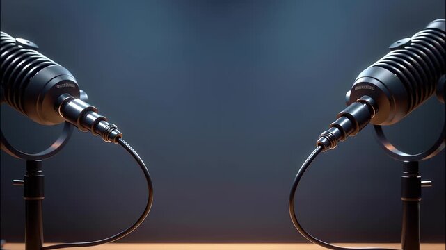 Modern microphones ready for conversation, podcast, interview, wooden table, studio setting, warm lighting, creative workspace, audio recording, digital content, teamwork.