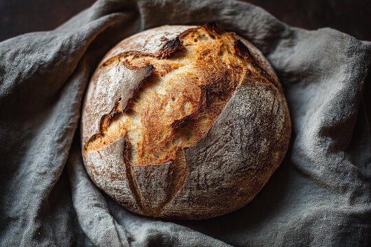 Modern grey kitchen interior showcasing artisan bread on a marble island. Stainless steel appliances and fresh flowers evoke a warm, highend culinary lifestyle. Ideal for real estate.