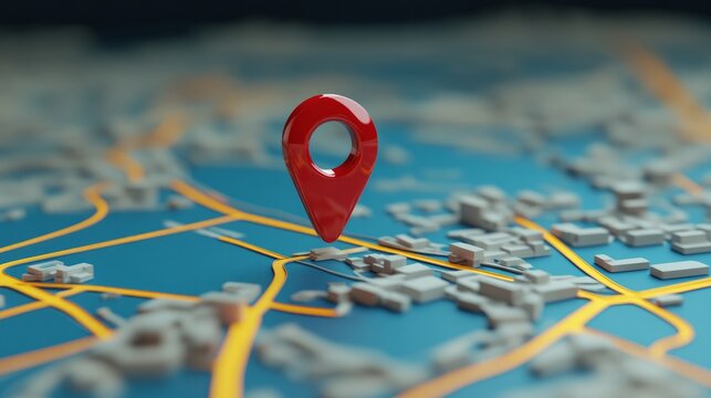 A red GPS pin marker over a digital map with a vibrant blue background.
