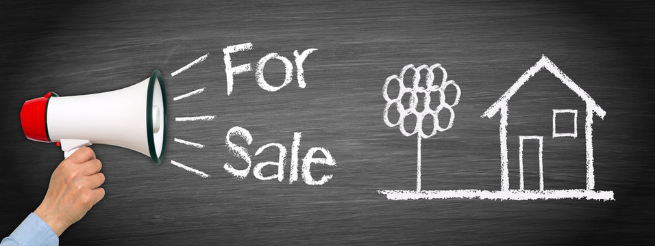 Blank white yard sign stands on green lawn before brick house. Sign ready for custom text. Real estate sale advertisement, house for sale, realtor sign. Property listing outdoor.