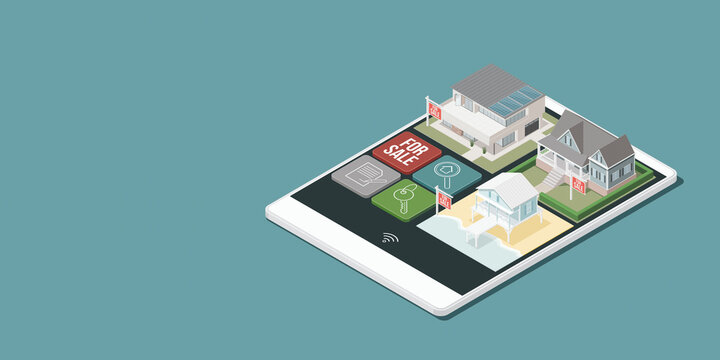 Smartphone application for online searching, buying, selling and booking real estate. Unusual 3D illustration of beautiful house on smart phone in hand