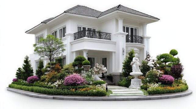 Elegant white house surrounded by beautifully landscaped gardens featuring vibrant flowers, topiary designs, and statues, ideal for real estate marketing, home improvement articles