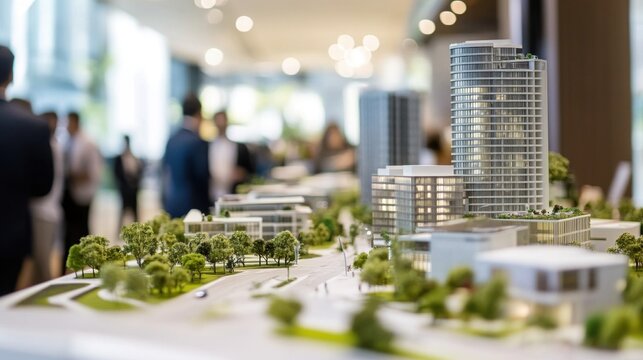 Real estate networking event showcasing a miniature model house in a modern interior setting with professionals discussing opportunities