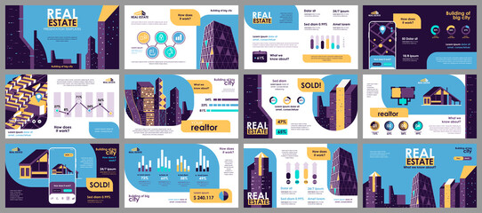 Real estate presentation slides templates from infographic elements and vector illustration. Can be used for presentation real estate agency, brochure, marketing, annual report, banner, booklet.