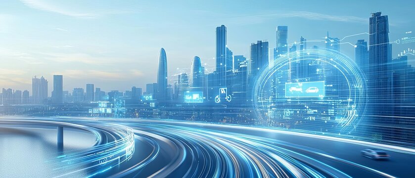 A high-tech logistics hub with real-time data on the integration of robotics, automated vehicles, and distribution management for seamless development