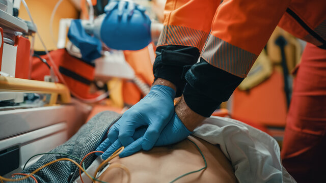 EMS Paramedics Team Provide Medical Help to Injured Patient on the Way to Hospital. Emergency Care Assistants Perfroming Cardiac Massage to Bring the Man Back to Life in an Ambulance.