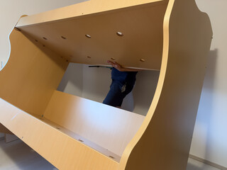 Man assembling wooden bunk bed frame during home renovation or furniture rearrangement