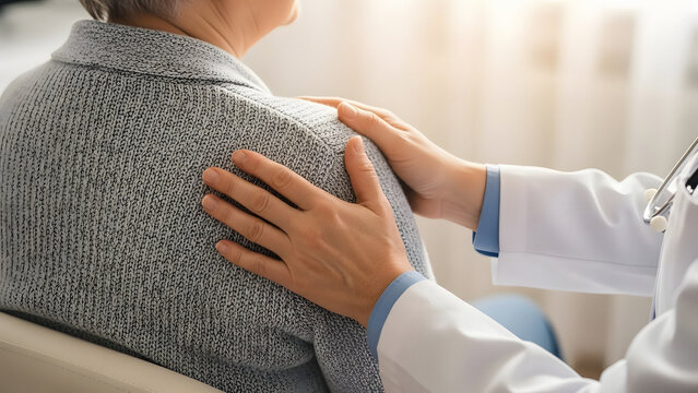 Hand of doctor reassuring her female patient.