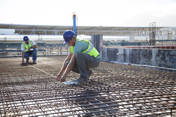 Construction workers arranging rebar at construction site