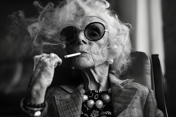 An elderly woman exudes a rebellious spirit, smoking a cigarette with sunglasses on, her image a contrast of elegance and edginess in monochrome.