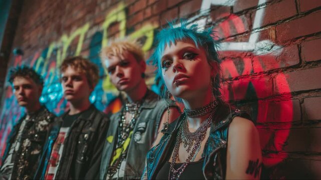 Punk teens standing in front of graffiti wall looking defiant, rebellious youth subculture group with bold fashion, attitude and alternative street style