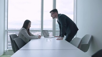 Depressed mid aged white male employee feeling guilty and frustrated while being scolded by furious female boss for bad work result and declining project rates in financial report during corporate