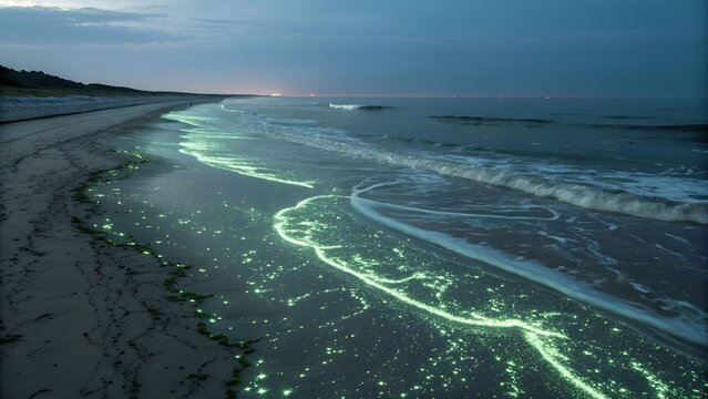 Glowing algae trails on wet sand as waves recede at night
