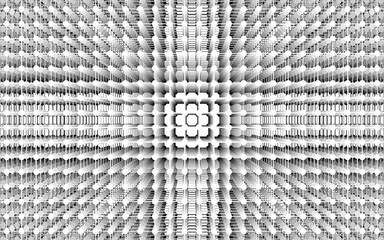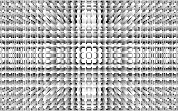 The image is a black-and-white abstract pattern with a strong sense of three-dimensional depth. It's composed of a grid of tiny, box-like structures that recede towards a central point.