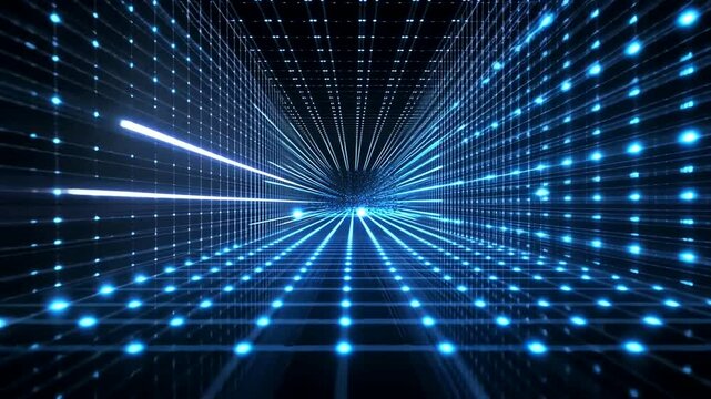 Glowing lines recede into a distant point, with illuminated points. Lines define the virtual grid