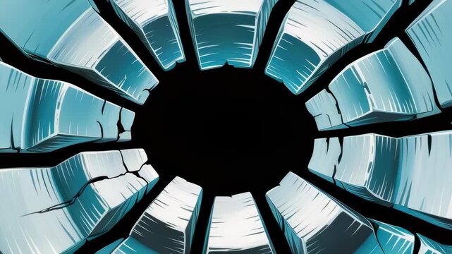 Shattered turquoise ice shards recede and rotate around central void