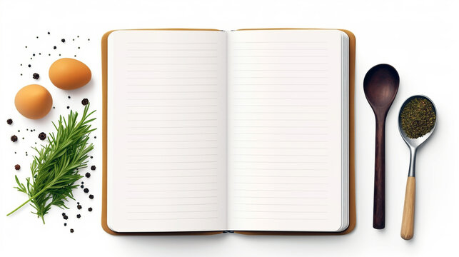 An inviting kitchen workspace showcasing empty recipe book surrounded by various spices and cooking utensils for culinary inspiration