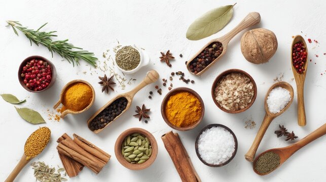 an open recipe book surrounded by an array of different ingredients on a pristine white wooden table, leaving ample space for text.