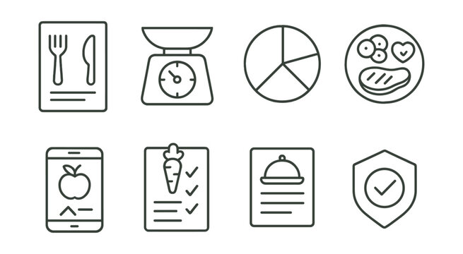 Line vector icons of diet and nutrition: meal plan, food scale, macro chart, healthy plate, calorie tracker, grocery list, recipe card, diet badge.