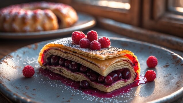 Healthy breakfast with cannabis. Tea, fresh pancakes and hemp leaf on the table