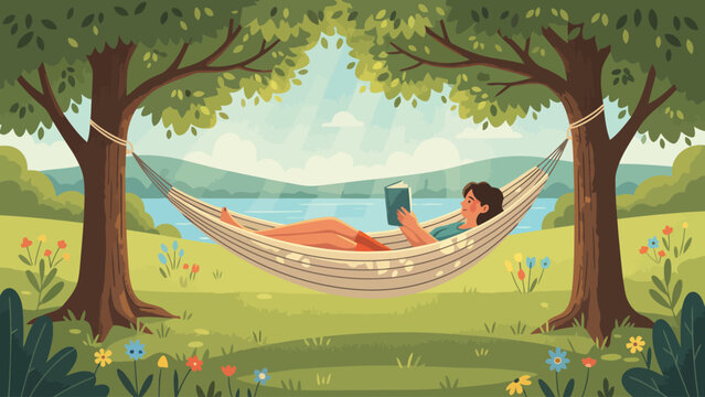 Person Relaxing in Hammock Between Trees Reading a Book.