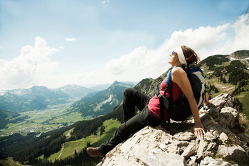Mature woman sitting on cliff, hiking in mountains, Tannheim Valley, Austria