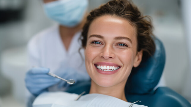 Close-up of a woman reclining in a dental chair while a dentist in gloves and mask examines her teeth with professional tools, bright clinical lighting, clean and modern dental off