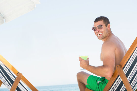 Man in swim trunks relaxing on chair under umbrella holding martini glass on beach, copy space