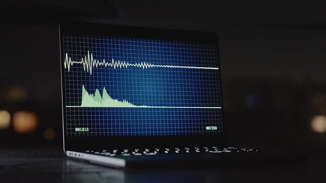 Sound waveforms on laptop screen at night in dark office wiretapping operation. Spyware tracking and listening to remote conversation picking up surveillance audio during investigation by agency spy