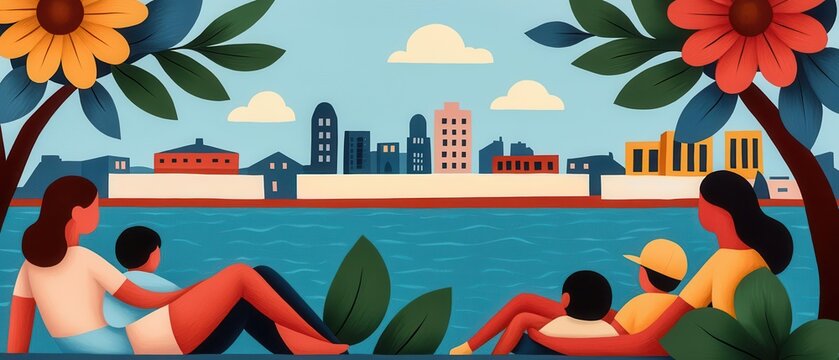 Calm Labor Day waterfront scene with families resting, interspersed with labor rights banners recognizing the importance of the holiday