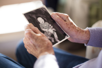 A close-up view showcases a senior woman's hands as she carefully holds and examines old photos
