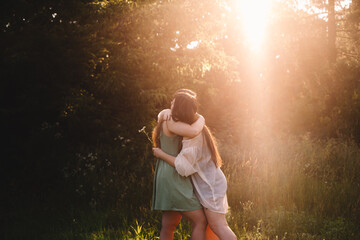 Lesbian couple embracing in forest during summer