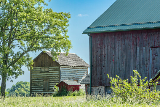 An historic two-story reconstructed log cabin and a vintage wooden dairy barn with a new metal roof in a park.