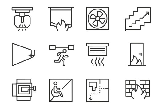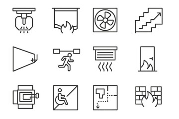 Building Fire Protection Icons. Line style icons of building fire protection: sprinkler head, fire curtain, fireproof glass, stair
