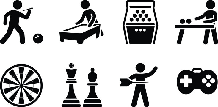 A collection of eight black silhouette icons representing various popular recreational games and indoor sports
