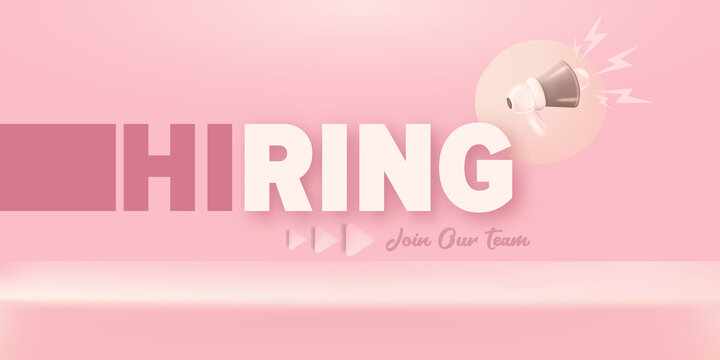 We are hiring an advertising horizontal banner with a megaphone on pastel pink background. Banner with a megaphone for promoting your announcement