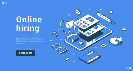 Online hiring head hunting application with vacation finding job or employee internet banner landing page isometric vector illustration. HR service recruitment business opportunity candidate hire