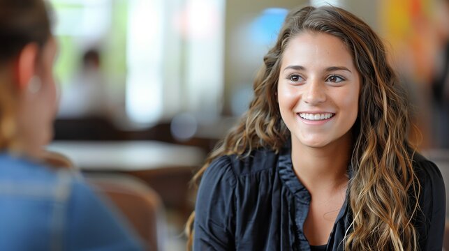 Smiling young woman engaging in a pleasant conversation during a human resources interview.