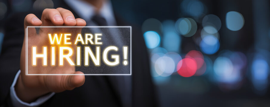 Business recruitment drive with We're hiring sign, focus on, expanding team, vibrant, Composite, conference room backdrop