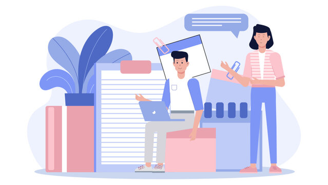 Title Man and woman discuss a job application. Suitable for business articles, career blogs, job recruitment websites, HR presentations, diversity training materials.