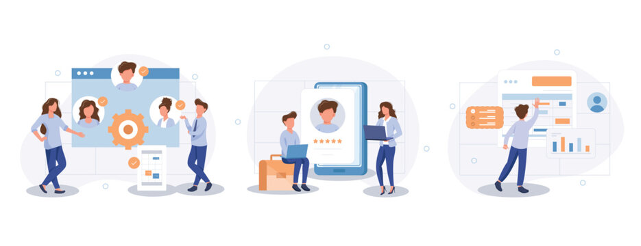 Characters hiring new employees, planning human resources and schedule to increase productivity and quality of work. Business illustration set. Workforce management concept. Vector illustration