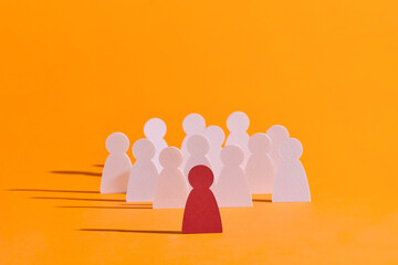 White paper human figures following red one on light background.