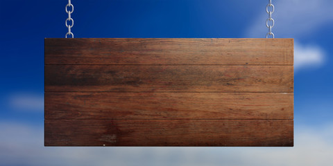 Wooden blank sign isolated on blue sky background. 3d illustration
