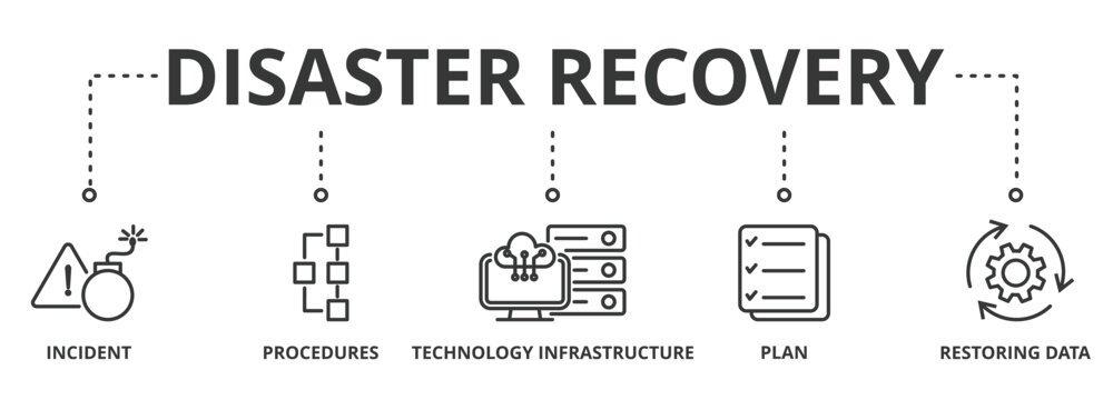 Disaster recovery banner vector illustration concept for technology infrastructure with icon of the incident, procedures, technology infrastructure, plan and restoring data
