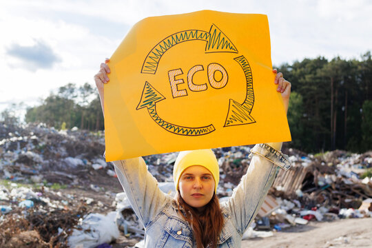 A young woman raises a yellow ECO recycling symbol sign at a waste site, advocating for environmental responsibility and a greener future.