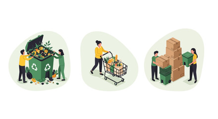 earth day awareness recycling education, People sorting recyclable bottles into green bins outdoors.