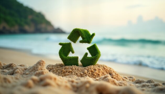 Eco friendly recycling symbol made of green grass on sandy beach near calm turquoise sea. Sustainability concept. Protecting environment, nature. Recycling idea for eco lifestyle. Beach vacation at